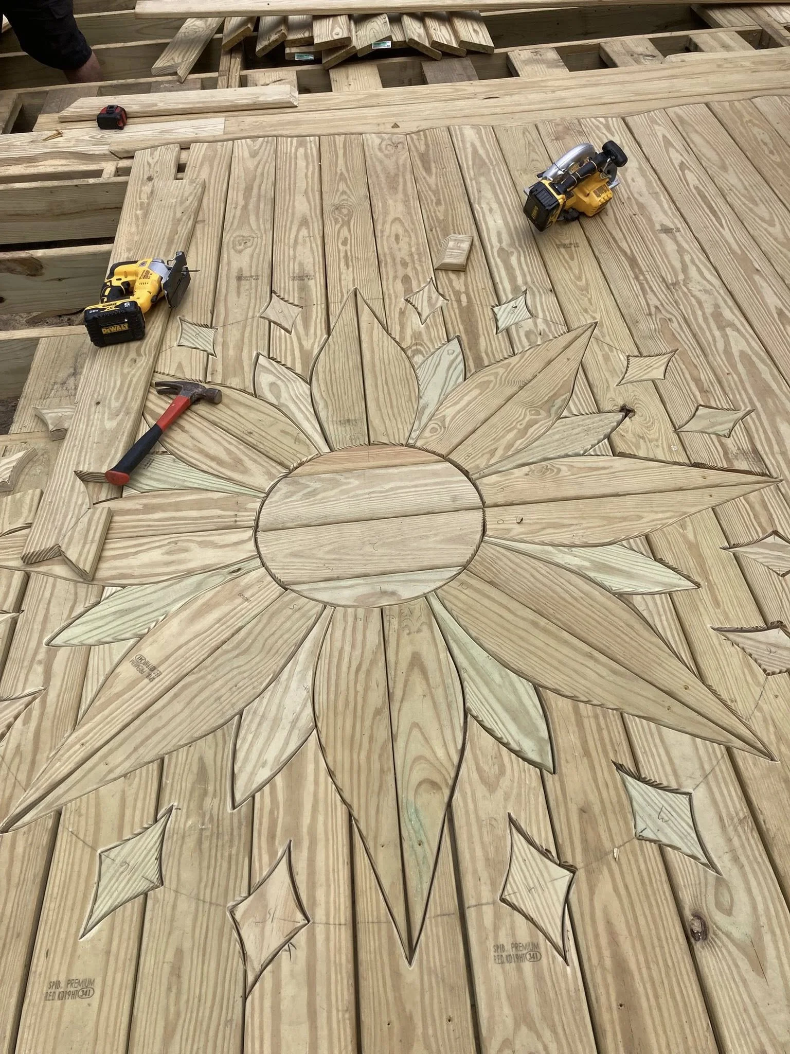 The deck will be a main focus at The Nest. With over 750 square feet we will have musicians, an outdoor kitchen area, gatherings, movies and classes. The builders are making this a one of a kind work of art with inlays of flowers and a tree. Making The Nest even more special.